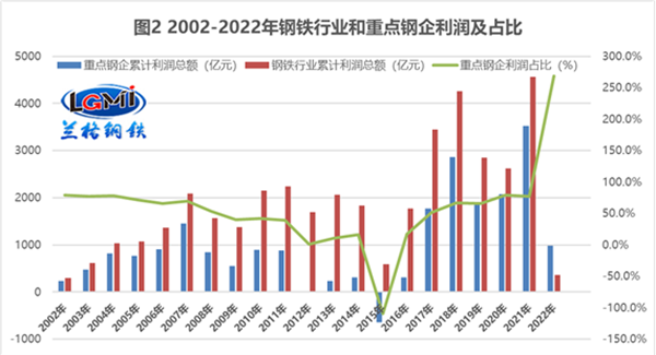 其一,從粗鋼產(chǎn)量數(shù)據(jù)來看,2022年全國粗鋼產(chǎn)量10.13億噸,其中重點鋼企粗鋼產(chǎn)量8.15億噸,占總產(chǎn)量的80.5%(詳見圖1)。從營收數(shù)據(jù)來看,2022年鋼鐵行業(yè)實現(xiàn)營業(yè)收入87147億元,其中重點鋼企實現(xiàn)營業(yè)收入65875億元,占總營收的75.6%。從銷售利潤率數(shù)據(jù)來看,2022年鋼鐵行業(yè)全年的銷售利潤率僅僅為0.4%,而重點鋼企的銷售利潤率為1.5%,高出整體行業(yè)1.1個百分點。從利潤數(shù)據(jù)來看,2022年鋼鐵行業(yè)實現(xiàn)利潤總額365.5億元,其中重點鋼企實現(xiàn)利潤總額982億元,重點鋼企的利潤總額竟然高出整體行業(yè)如此之多(詳見圖2),而作為鋼企龍頭的中國寶武去年實現(xiàn)利潤總額312.8億元,占重點鋼企利潤的31.8%;而暫居鋼鐵行業(yè)利潤榜第二位的湖南鋼鐵集團實現(xiàn)利潤總額150.3億元,占重點鋼企利潤的15.3%;中國寶武和湖南鋼鐵集團總計的利潤占比達到了47.1%,近半壁江山,這表明國內鋼鐵行業(yè)兼并重組的效應正在深度發(fā)酵著,八成的產(chǎn)量實現(xiàn)了七成的營收更實現(xiàn)了鋼企利潤的明顯提升。