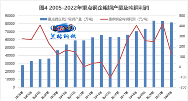 其二,從噸鋼利潤數(shù)據(jù)來看,2022年整體鋼鐵行業(yè)噸鋼利潤呈現(xiàn)快速下降的態(tài)勢,全年的噸鋼利潤僅在五十元左右(詳見圖3),而重點鋼企的的噸鋼利潤可以達到百元左右(詳見圖4),這表明在鋼材市場大幅波動的環(huán)境中,大中型鋼鐵生產(chǎn)企業(yè)的抗風險能力明顯增強,同時也表明了這幾年鋼企針對下游需求變化而進行的產(chǎn)品結構調整正在發(fā)揮著有效作用。